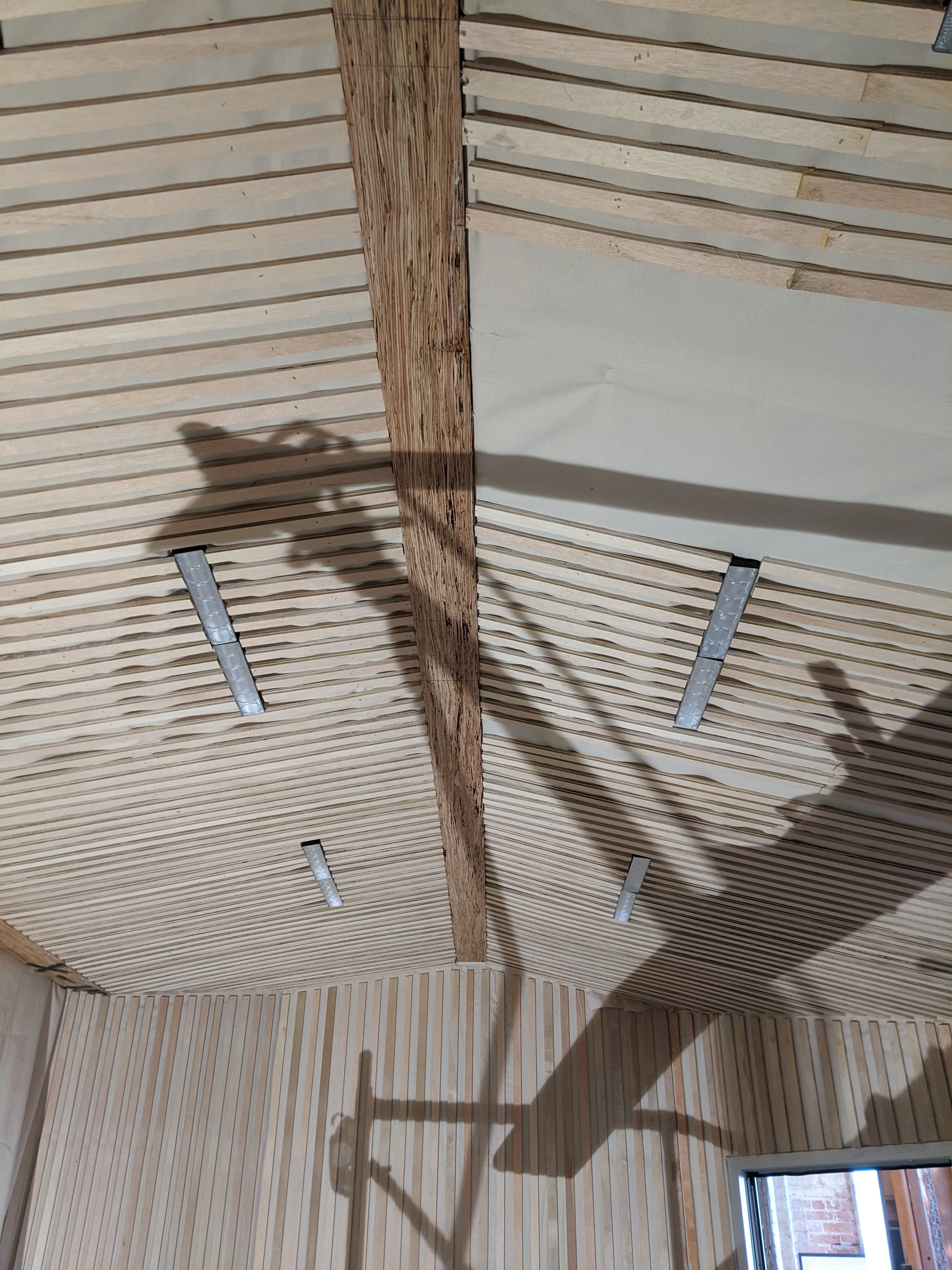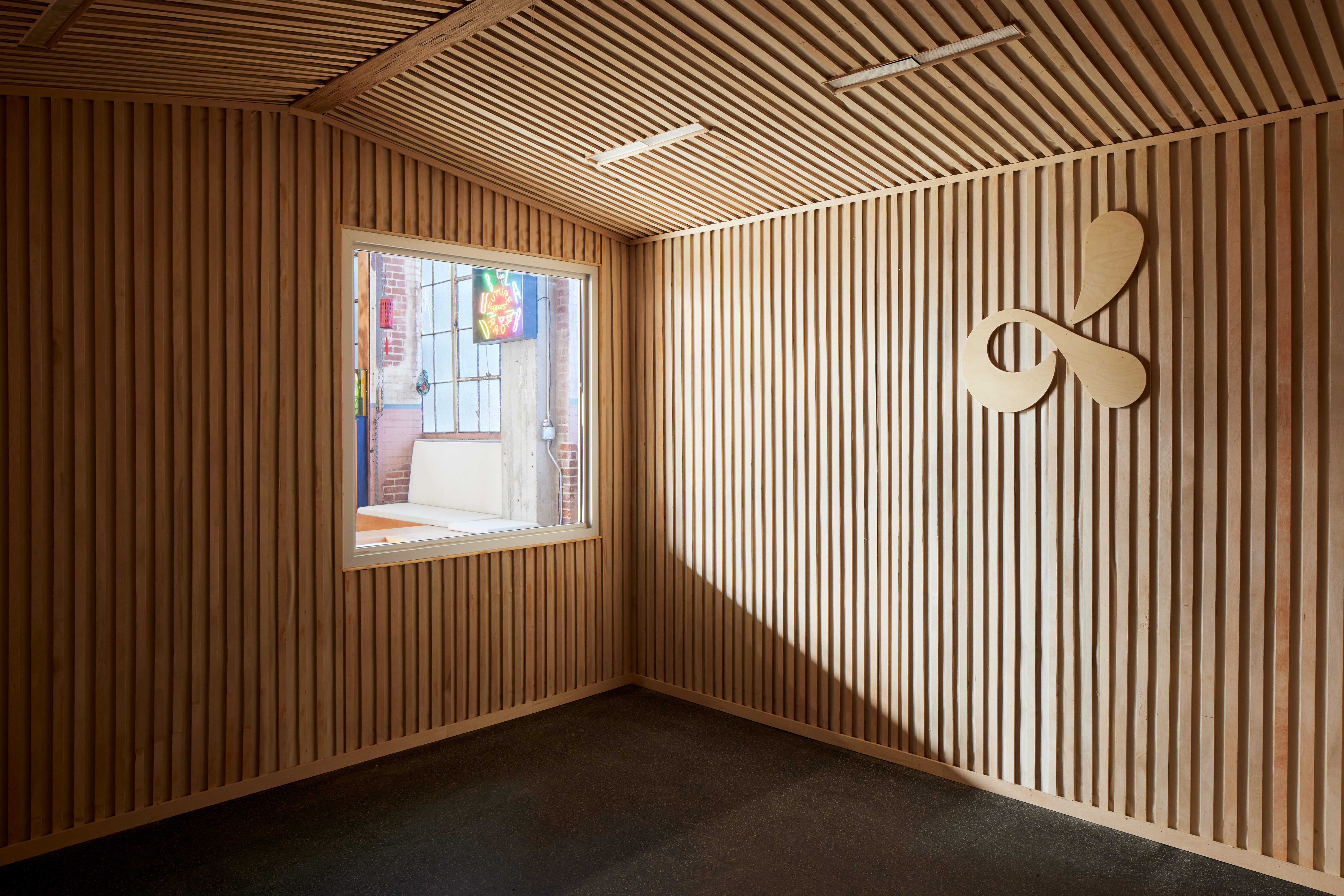 The interior build out regulates the flow of sound within the studio. While the Mass Plywood Panels keep noise from leaving the interior, a wall assembly using a combination of plywood slats, mineral wool insulation and fabric help absorb sound to keep the reverberation to a minimum.